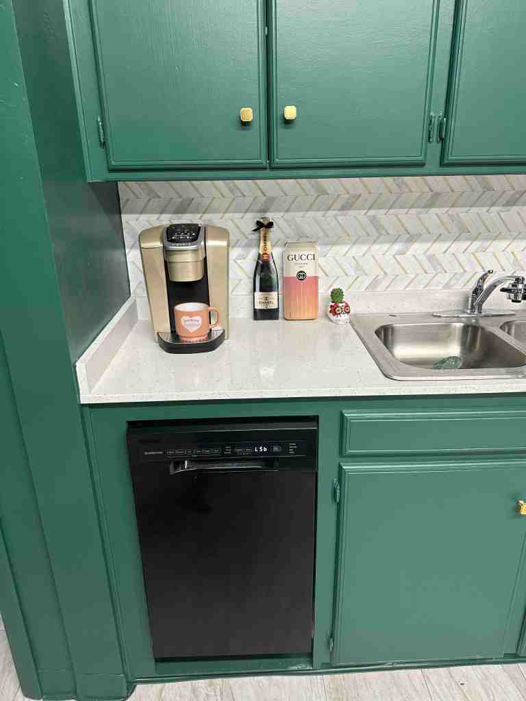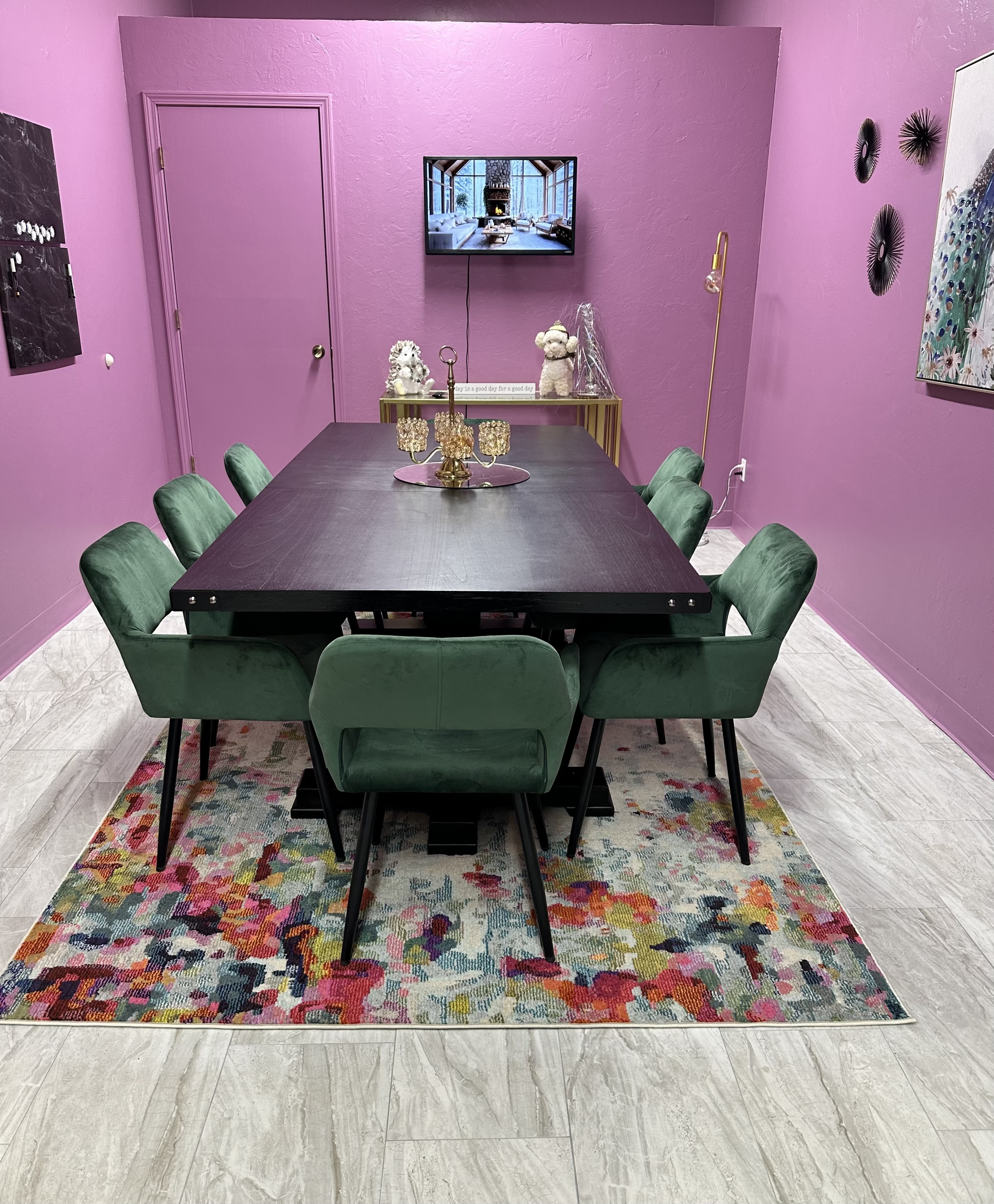 This Art Deco-inspired board room doubles as a dining room, taking it from business to party based on your needs. With a TV, marble magnetic blackboard, eight luxurious velvet green seats, and double green doors, it’s an elegant space to gather for work or celebration. Seats up to 8. Access to the Grand Kitchen with a prep table and seating, buffet, and black stainless steel fridge.